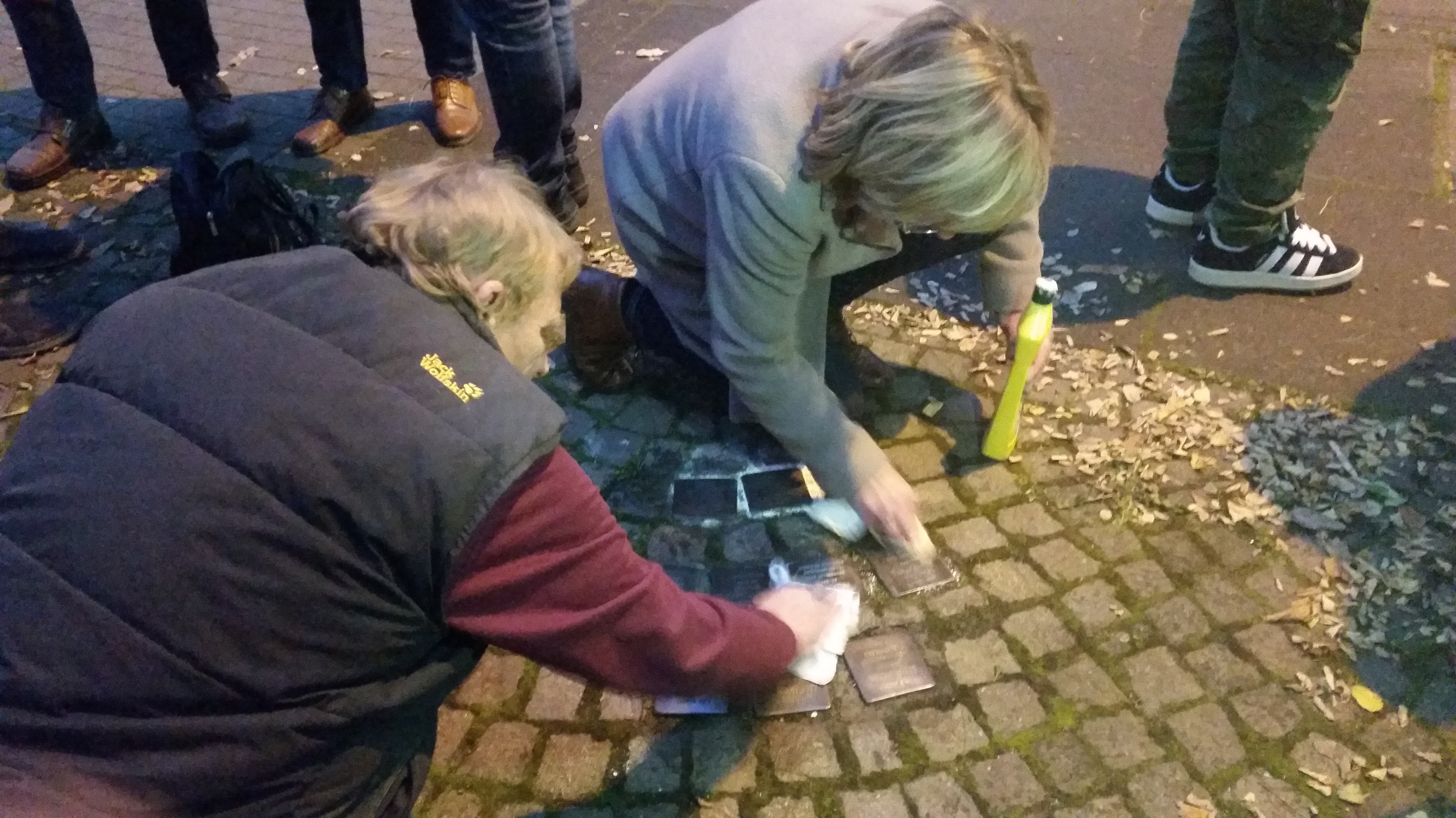 Zu Beginn der Gedenkveranstaltung wurden Stolpersteine vor dem Haus Hindenburgstr. 1 gereinigt.